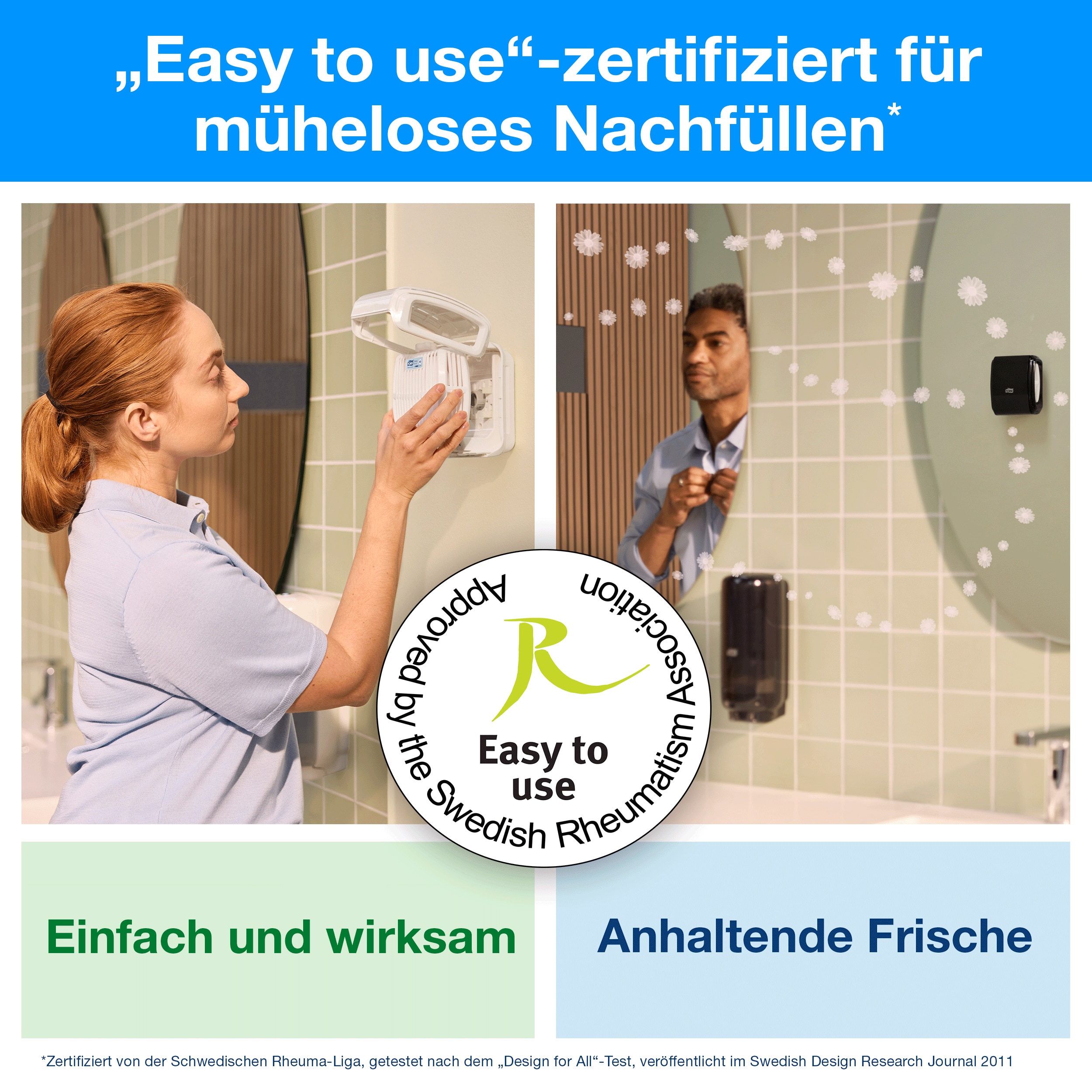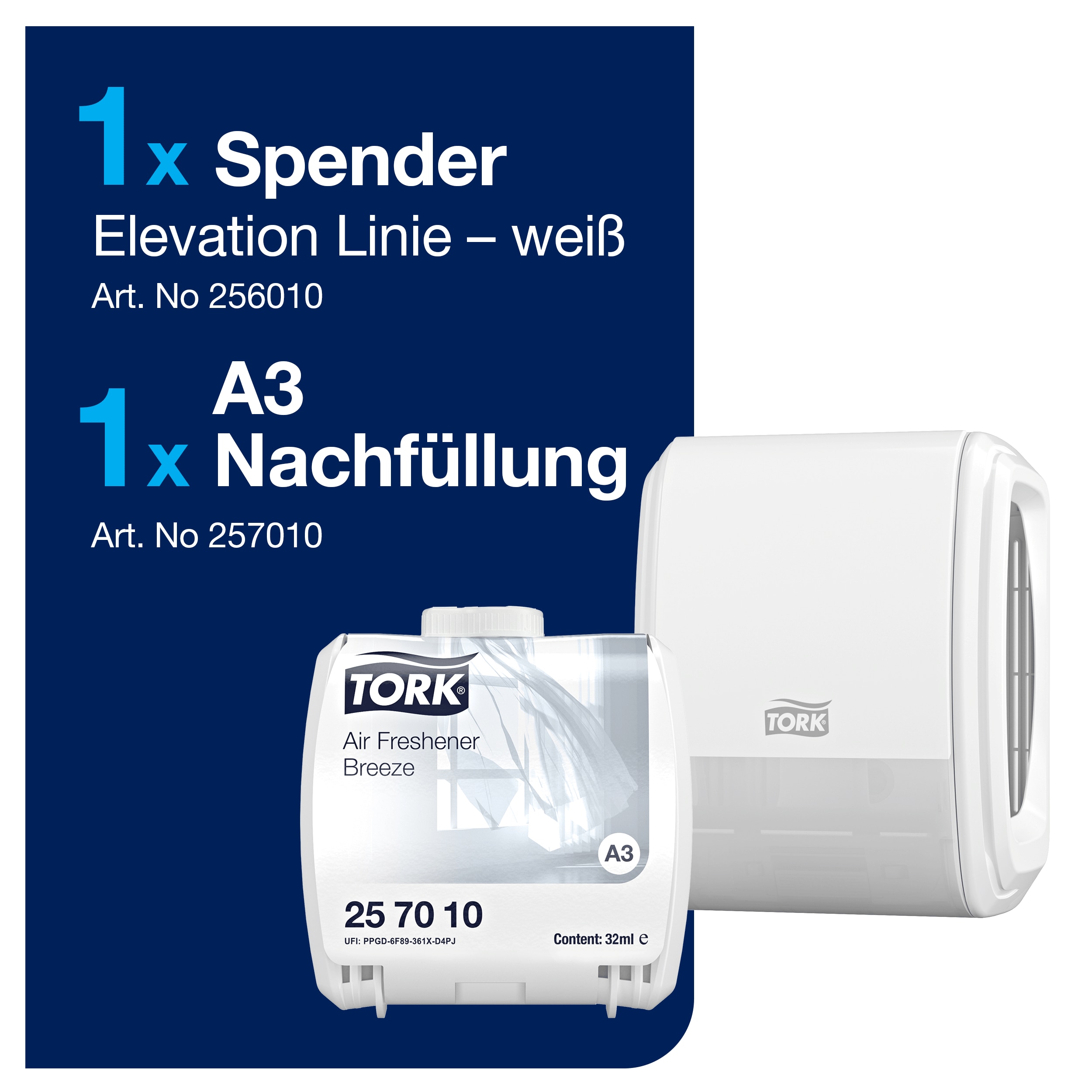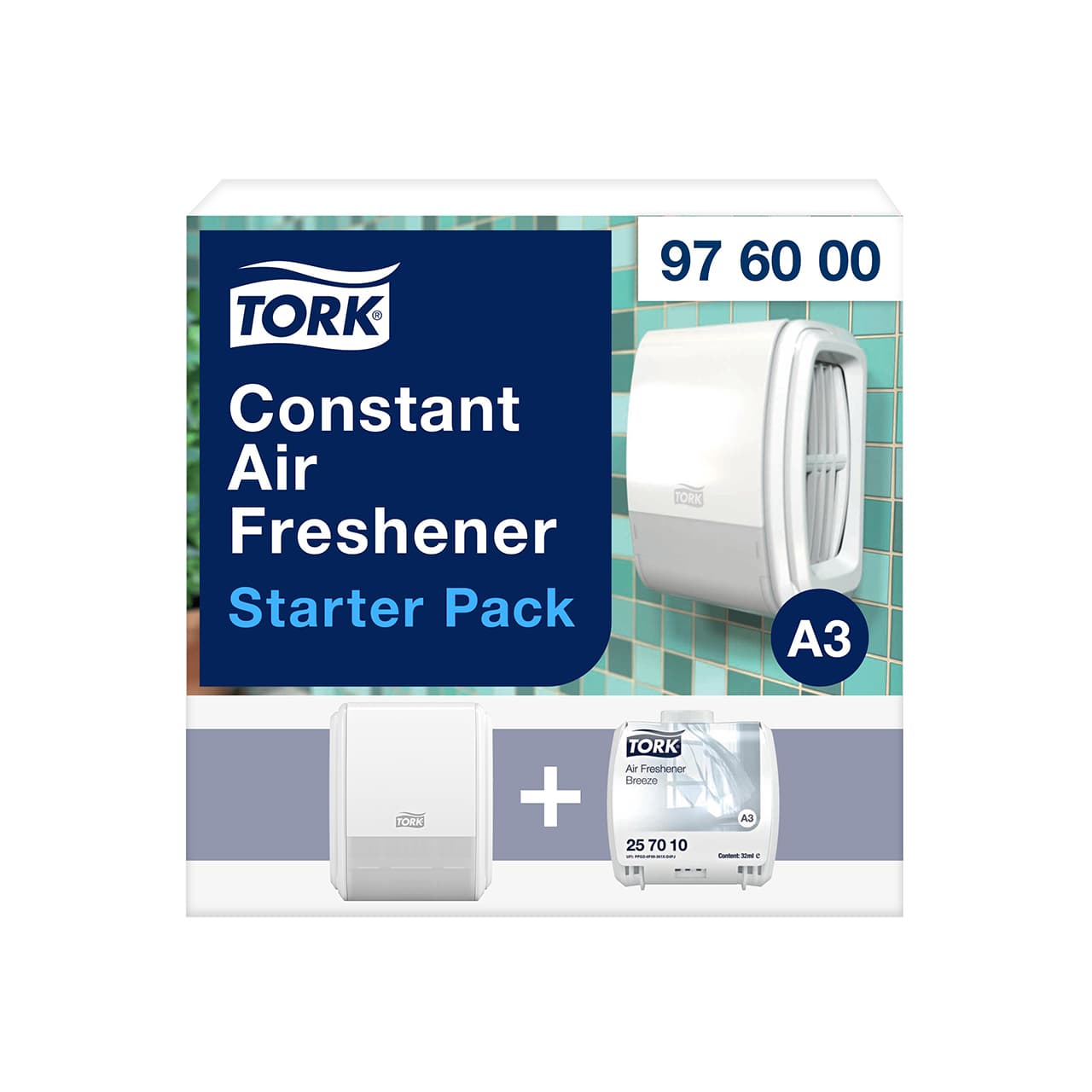 Tork Starter Pack für kontinuierlichen Lufterfrischer Weiß A3: Erzeugen Sie ein einladendes Waschraum-Ambiente mit dem Tork Starter Pack für kontinuierlichen Lufterfrischer, bestehend aus einem Spender und einem Nachfüllflakon Frühlingsbrise. Die einzigartige Duftspender-Technologie* lässt den Duft kontinuierlich ausströmen und sorgt für lang anhaltende Frische, die nicht verfliegt, während Geruchsneutralisatoren unangenehme Gerüche beseitigen. Das Nachfüllen ist einfach, da der „Easy to use“-zertifizierte** Spender niedriger platziert werden kann als herkömmliche Systeme. * Die patentierte Technologie basiert auf einer bewährten Brennstofftechnik der pharmazeutischen Industrie, wo eine präzise Dosierung zur Behandlung von Menschen und Tieren unverzichtbar ist. ** Zertifiziert von der Schwedischen Rheuma-Organisation, getestet nach dem „Design for All“-Test, veröffentlicht im Swedish Design Research Journal 2011