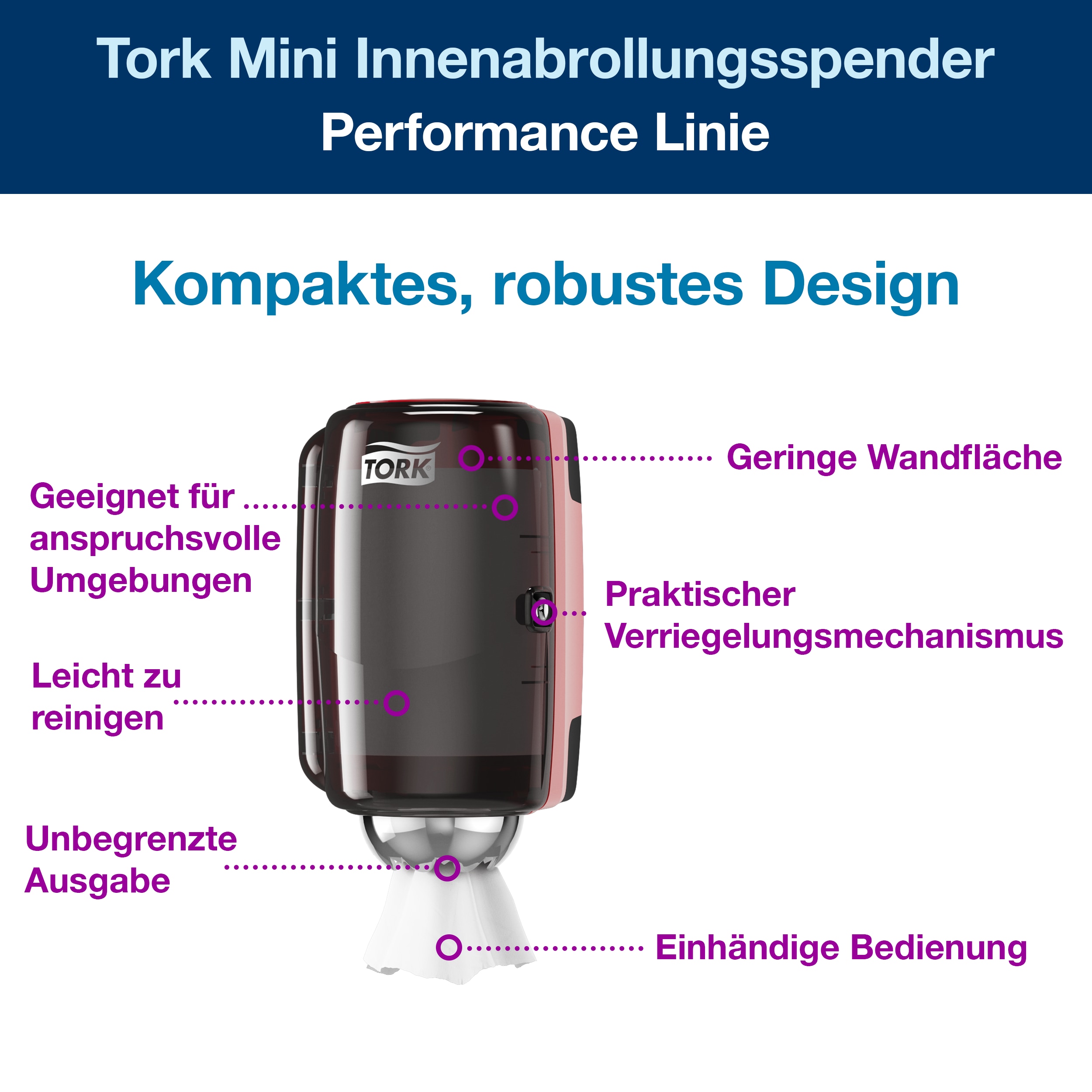 Tork Mini Innenabrollungsspender Rot und Schwarz M1: Mit kompakter Größe und robuster Bauweise ist dieser Tork Mini Innenabrollungsspender ideal für raue gewerbliche Umgebungen und enge Räume. Das Modell ist leicht zu reinigen und verbessert die Hygiene. Mit der uneingeschränkten Ausgabe entnehmen Sie so viel Industrie Papierrolle wie Sie benötigen, um Hände und Oberflächen abzuwischen. Sie können den Wischtuchspender einhändig bedienen. Ein praktischer Verriegelungsmechanismus verhindert falsche Bedienung oder Verschwendung und spart so Geld.