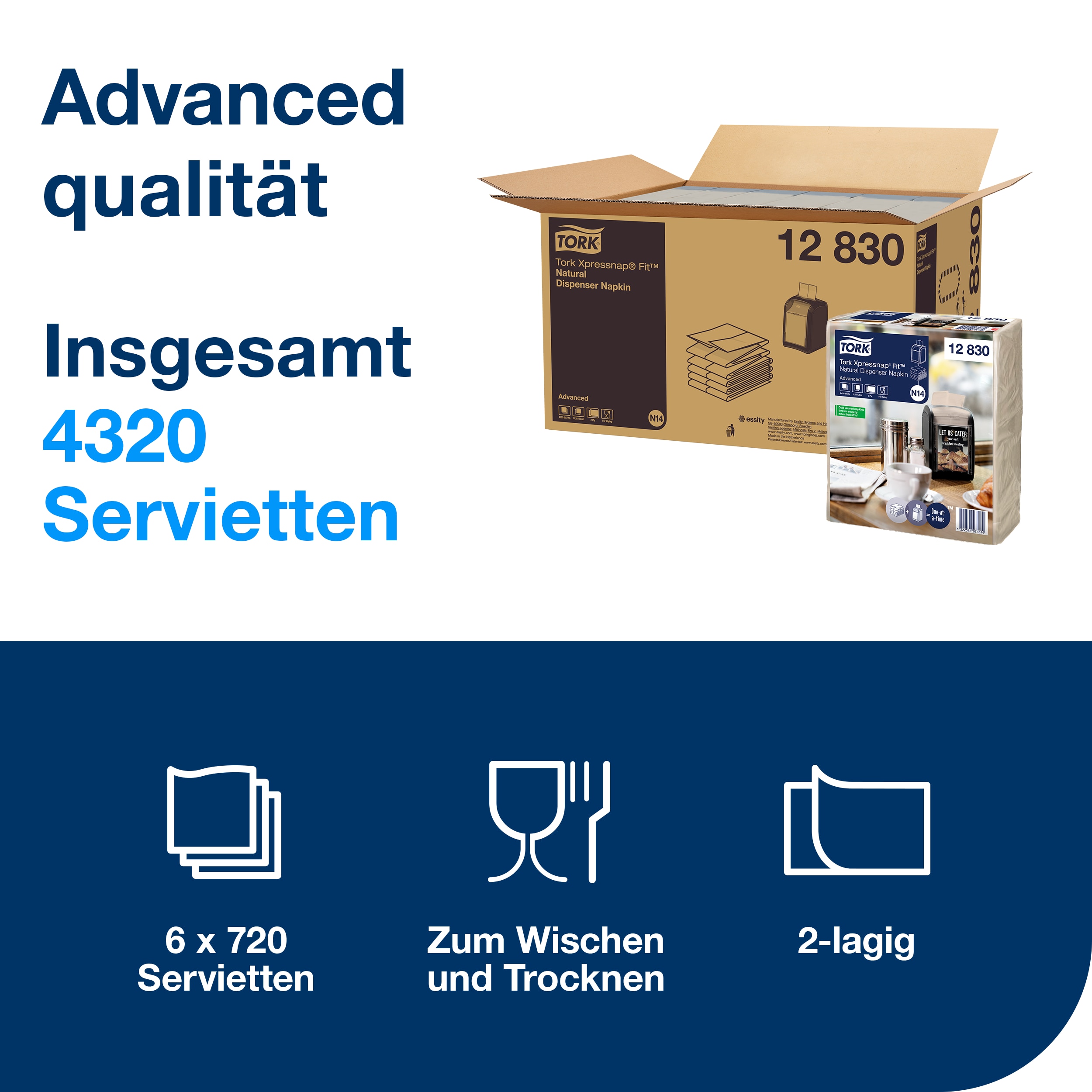 Tork Xpressnap Fit® Natur Spenderserviette N14: Mit den Tork Xpressnap Fit® Natur Spenderservietten erhöhen Sie die Effizienz und verringern das Abfallaufkommen in Ihrem Schnellrestaurant. Die Einzelblattentnahme reduziert den Verbrauch und verbessert die Hygiene, da Gäste nur das berühren, was sie brauchen. Dank der kompakten Falzung nimmt Ihr Serviettenbestand 35 % weniger Platz ein als Tork Counterfold Servietten. Die hohe Kapazität verlängert die Zeit zwischen den Nachfüllungen der Spender. Zudem wird das Personal die Tork Easy Handling Verpackung schätzen, die das Tragen, Lagern und Öffnen der Servietten erleichtert.