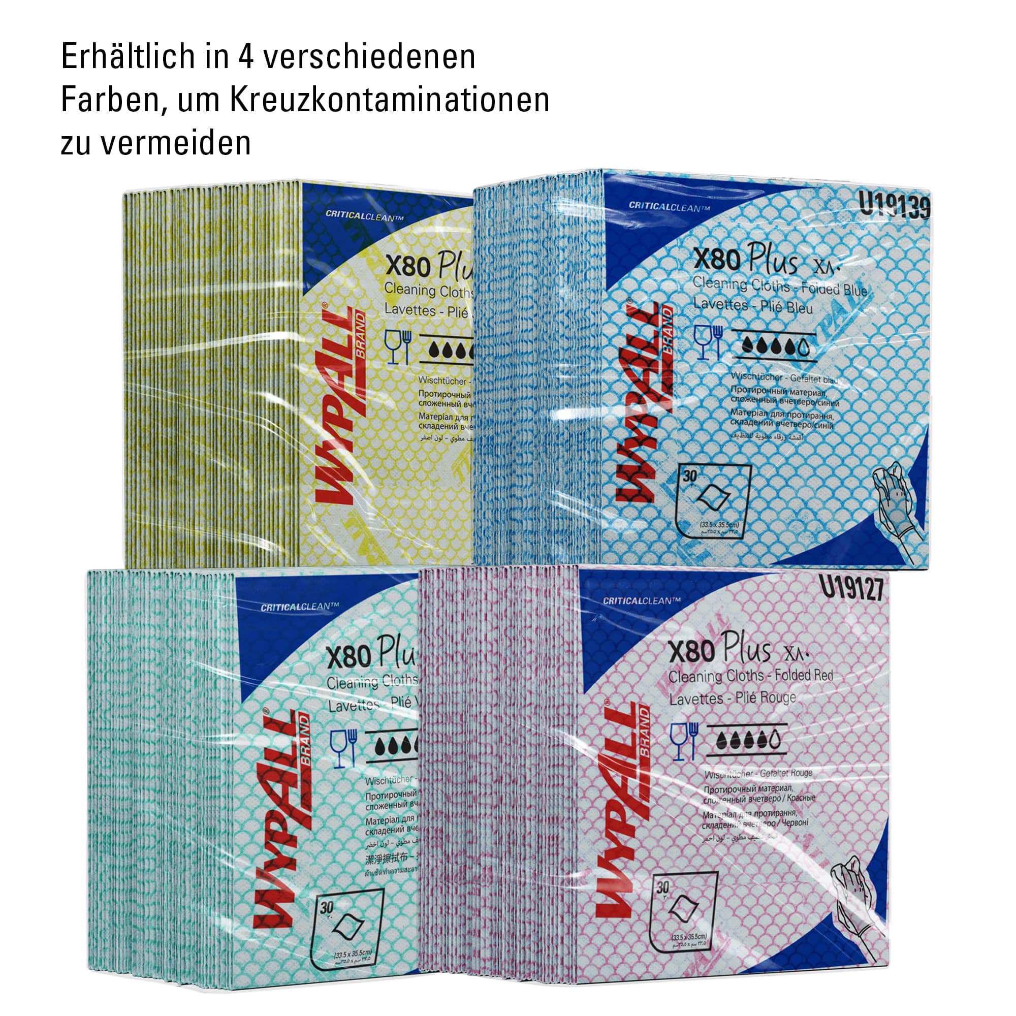 - Die WypAll® X80 Plus Critical Clean™ Reinigungstücher sind für den Kontakt mit Lebensmitteln zugelassen und in vier verschiedenen Farben erhältlich. Dies unterstützt die farbcodierte Reinigung, um das Risiko von Kreuzkontamination zu verringern und die Hygienepraxis und Einhaltung von Hygienevorschriften zu verbessern