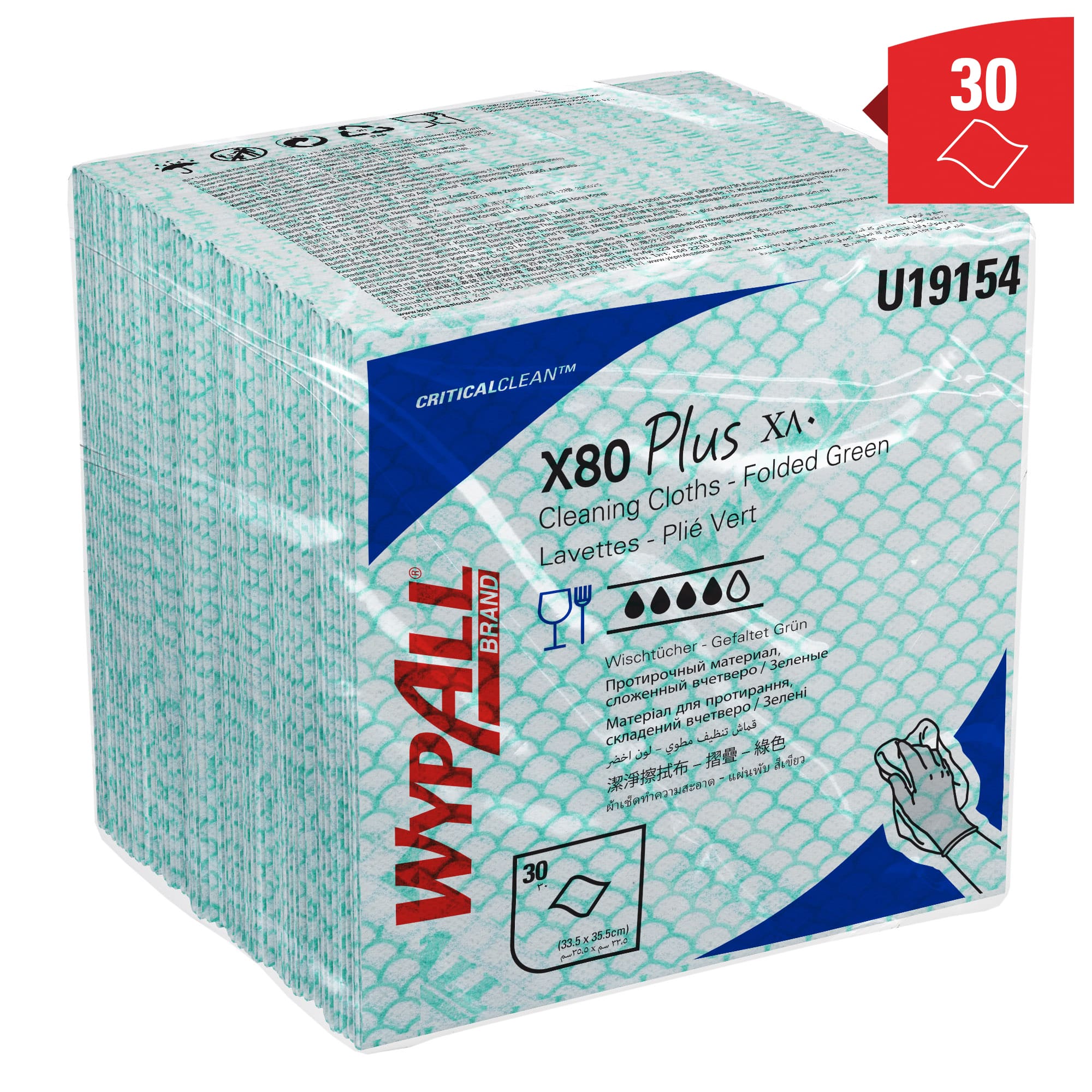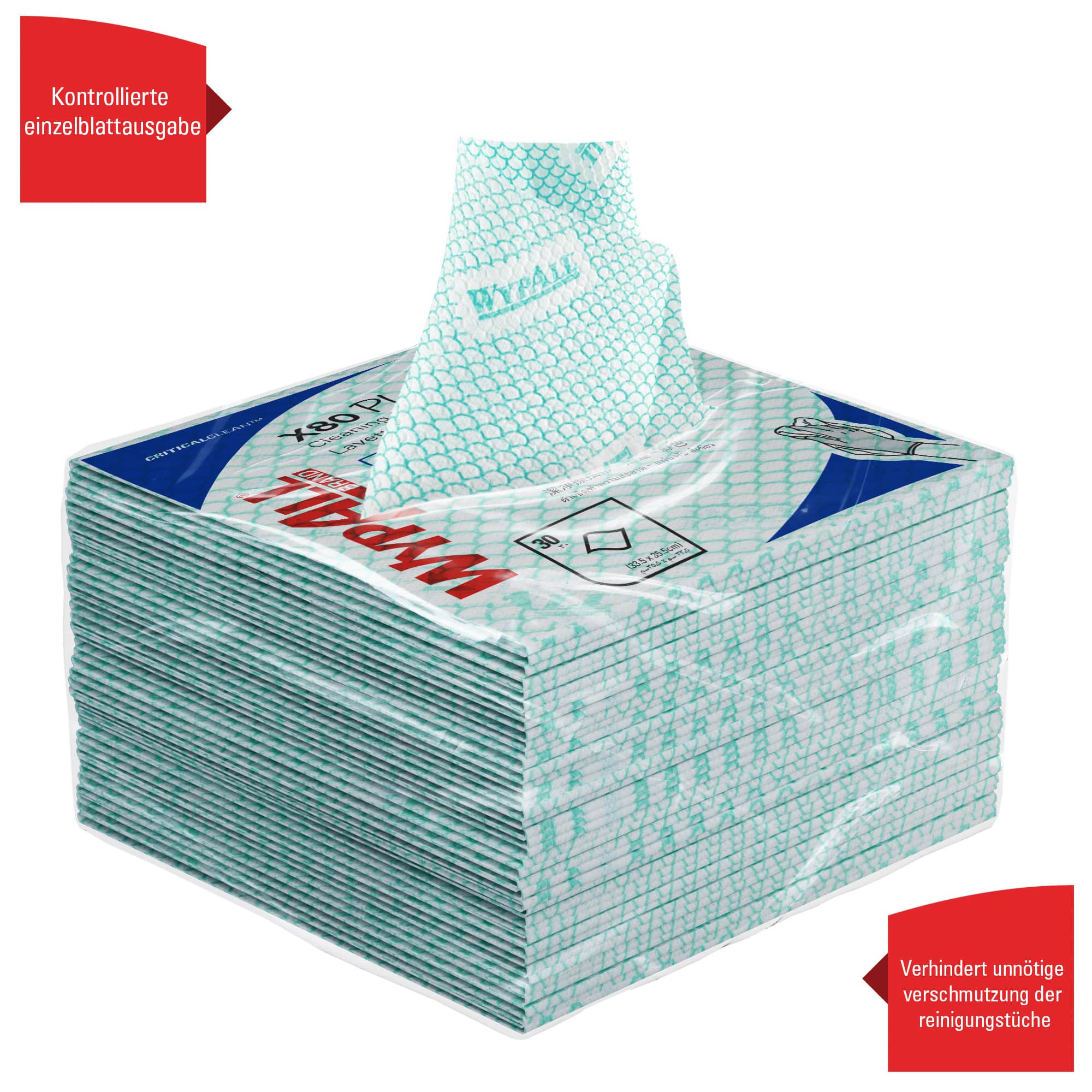 - Jede Packung mit grünen WypAll® X80 Plus Critical Clean™ Tüchern enthält 30 grüne, viertelgefaltete farbcodierte Reinigungstücher