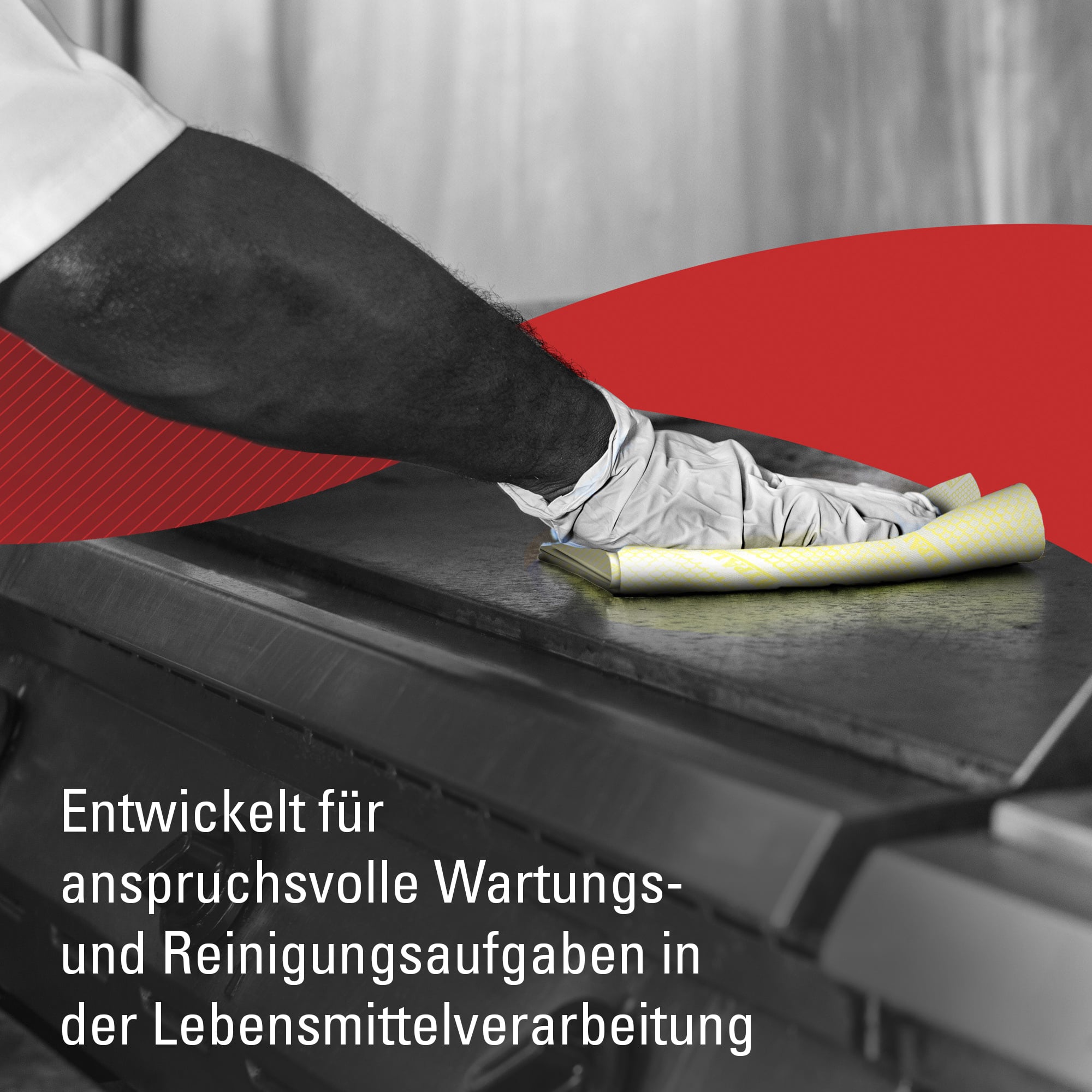 - Diese saugfähigen Tücher wurden für anspruchsvolle Reinigungsvorgänge in der Lebensmittelverarbeitung/Gesundheitsbranche entwickelt und verfügen für eine effiziente Reinigung über eine Powerpocket-Prägung für verbesserte Reinigung und Schmutzaufnahme